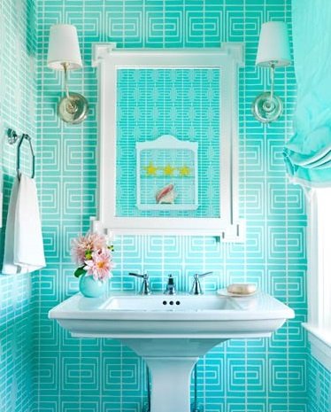 A bold bath in a New Jersey home makes a strong statement.Powder rooms are places where you can gild the lily, says designer Mona Ross Berman.We used a loud geometric in a bright ocean blue to give it a slightly over the top feeling.Wallpaper is Recessed from Studio Printworks.