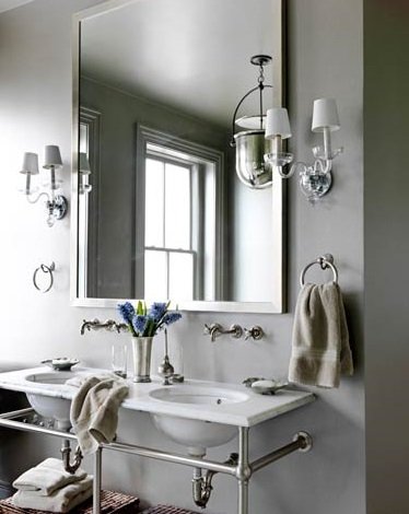 Designer Barry Dixon added sconces by Crowder and an Urban Smokebell lantern by Baker in the bathroom in a Victorian row house in Capitol Hill.I love this washstand from Waterworks, because I can hang wet towels without having to have towel bars everywhere, Dixon says.