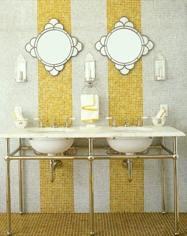 Glass tiles from Waterworks line the walls and floor in the guest bathroom of this California country home by designer Jay Jeffers.The amber stripes break up the space and add a note of whimsy.The pair of sinks are from Waterworks.Deco mirrors from Pottery Barn