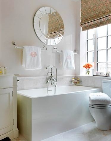 The master bath is truly feminine a serene and pretty oasis, says designer Christine Murphy about the master bath in a colorful New York City apartment.Glossy pale pink walls pick up on the pale pink accents in the marble tile from Complete Tile.Tub from Wetstyle Cube collection.
