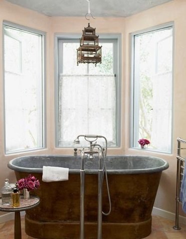 Determined not to decorate this Oyster Bay, New York, beach house with predictable blue and white, designer Christina Murphy chose tropical green instead.With fern wallpaper and sunlight streaming in from a skylight above the tub, it reminds us of a tropical rain forest.