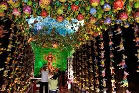 Pandals are canopies for housing Durga idol during the Durga Puja festival. These large canopies are supported by sets of bamboo poles adorned with multicolored fabrics. The making of Pandal involves lot of work, using wooden planks, bamboo poles and fabrics. Sometimes pandals are built on themes inspired by ancient civilizations such as Incas or Egyptian civilization. Today, people choose many modern and contemporary themes such as Harry Potter and RMS Titanic. The d?cor of pandals are generally prepared by architecture and art students in Kolkata. However, the expenses for theme based pandals are usually higher than traditional pandals. They also draw large crowds during the celebration. Today, themebased pandals have become rage all over Bengal and in other parts of India. Many of the Durga Pandals being financed by rich have also become trends in Barwari Puja that is community celebration of Durga Puja. Of late, there are even luxury designer pandals strewn with intricate patterns, flowers and lightings so much so that the pandals almost appear like palaces. In these elegantly designed pandals, the goddess Durga is worshipped and hordes of people pour in to pay visit and pray to the goddess to seek her blessings.Durga Idols seen in West Bengal are very famous and are made by skilled artisans. These artisans follow strict rules that each and every material that goes into the making of idols are obtained from the proper sources as per the traditions. They take almost several months to form beautiful idols of Durga. Often bamboo sticks are utilized to create the interiors of the idol and also to get the correct shape for the idol. Jutes ropes, strings and straw are also being used for the making of idol.