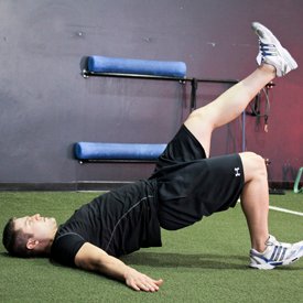 Lie on the floor with your hands at your side. Bend one leg and keep one straight. Perform the bridging movement by pushing through the heel on the floor and squeezing your glutes.