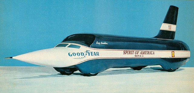 The Spirit of America was a recordsmashing vehicle that held its own against the Green Monster and Wingfoot Express in the 60s. Piloted by Craig Breedlove, the Spirit of America utilized a F104 Starfighter fighter jet engine, the same as the Green Monster, but with greater success. In 1965, Breedlove was able to break the 600 miles per hour barrier, a feat that had not been accomplished until then. During a failed run in 1964, the Spirit of America actually crashed, leaving skid marks for five miles before crashing into a pond. This earned the Breedlove another dubious place in the record books, for longest skid marks.
