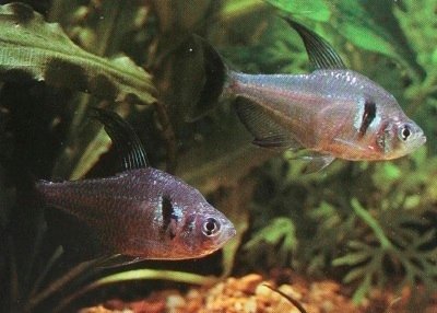 The Black Phantom Tetra grows to 2 inches. It is a hardy species that does well in both small and large groups. Their flat oval body is silvery gray with a distinctive splash of black edged in white just behind the gills. The fins of the male are edged in black, while females are more brightly colored and have red fins. The males will sometimes visually threaten each other by facing off and spreading out their fins.