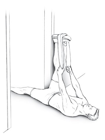 Lie flat on your back in a doorway with the hips placed in front of the doorframe. Raise the right leg and rest it on the doorframe. Keep the right knee straight and the left leg flat on the floor. Place a towel, cloth, or band over and around the toes and grasp both ends firmly with the hands. Keeping the right leg straight, place the hands on the doorframe and slowly move the buttocks through the doorframe until you feel a stretch in the back of the leg. Once you feel the stretch in the back of the leg, use the towel to pull the toes and foot down toward the head.