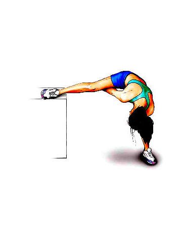 Stand with the right side of the body near a table, bench, or object at the approximate height of the hips. While balancing the weight on the left leg, raise the right leg and position it on the table, bench, or object. Keeping the knees straight, bend the trunk over between the knees as far as possible. As you bend the trunk, reach between the knees and place the hands behind the thighs.