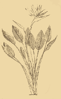 LEAVES numerous, standing upright on their footstalks, about a foot in length, and four inches in breadth, ovato oblong, coriaceous, somewhat fleshy, rigid, smooth, concave, entire on the edges, except on one side towards the base, where they are more or less curled, on the upper side of a deep green colour, on the under side covered with a fine glaucous meal, midrib hollow above and yellowish, veins unbranched, prominent on the inside, and impressed on the outside of the leaf, young leaves rolled up.
