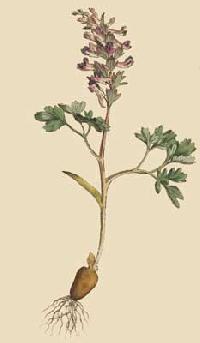 The hollow rooted Fumitory differs from the solida, already figured, and that constantly, in a variety of particulars, its root is always, as far as we have observed, hollow, appearing sometimes, as Parkinson informs us, like a shell, every part of which when broken will grow, frequently acquiring a very great size, the plant itself usually grows to twice the height of the solida, bearing foliage and flowers proportionably large, its bracte? or floral leaves, which in the solida assume a kind of fingerd appearance from the manner in which they are divided, in this are entire or but slightly indented, it flowers also about three weeks earlier.Of the Fumaria cava there are three principal varieties in point of colour, viz. the white, the blush coloured, and the purple, which, though plentiful in our gardens formerly, are now rarely met with, Mr. Chappelow informs me, that he found them all this spring, in an old plantation at Teddington, where they produced the most pleasing effect.It begins to flower in March and continues in bloom three weeks or a month, rarely produces any seed, so that it is to be propagated only by dividing its roots, it is a hardy herbaceous plant, a native of Germany, and will grow in almost any soil provided it be planted in a shady situation.