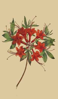 Whether the variety of the Azalea nudiflora here figured, was originally introduced to this country by Mrs. Norman of Bromley in Kent, or Mr. Bewick of Clapham in Surrey (both celebrated for their collections of American plants) we cannot with certainty assert, true it is, the Azalea coccinea was little known here till the sale of Mr. Bewicks plant in 1722, a considerable number of these shrubs formed the choicest part of that collection, and sold at high prices, one of them produced twenty guineas prior to this period, Mr. Bewick had presented one of the same sort of shrubs to Mr. Thoburn, the fruits of whose skill and assiduous care in the cultivation of American plants are apparent in his late nursery at Brompton, now Mr. Whitleys, and from the produce of which plant our figure was taken.The original species, found abundantly in the more southern parts of North America, was introduced, according to Mr. Aitons account, by Peter Collinson, Esq. about the year 1724.