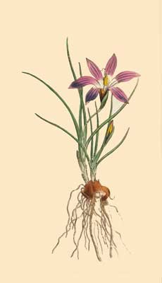 There are three plants cultivated in the gardens of the curious to which Bulbocodium is applied, either as a generic or a trivial name, viz. Narcissus Bulbocodium, Bulbocodium vernum, already figured, and the present plant the Ixia Bulbocodium and Bulbocodium vernum are given in this work, not so much for their beauty as their rarity, not so much to gratify the eye, as to communicate a knowledge of two plants but little known, and liable to be confounded from a similarity of their names.This is one of the few hardy species of the genus, and grows wild in many parts of Spain and Italy, it is said to have been found in Guernsey it affects hilly and dry situations, will grow readily in almost any soil, especially if fresh, and not infested with vermin it flowers about the middle of April, the blossoms do not expand fully unless exposed to the sun, and are not of long duration authors describe the wild plants as varying greatly in colour, vid. Clus. they are most commonly pale blue.Like the Crocus, it increases readily by offsets.
