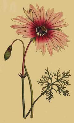 The genus of which this charming plant is the most distinguished species, has been named in honour of Lady Anne Monson. The whole family are natives of the Cape, and in their habit and fructification bear great affinity to the Geranium. The present species was introduced into this country in 1774, by Mr. Masson.We received this elegant plant just as it was coming into flower, from Mr. Colvill, Nurseryman, Kings Road, Chelsea, who was so obliging as to inform me that he had succeeded best in propagating it by planting cuttings of the root in pots of mould, and plunging them in a tan pit, watering them as occasion may require, in due time buds appear on the tops of the cuttings left out of the ground.It rarely or never ripens its seed with us.Should be treated as a hardy greenhouse plant, may be sheltered even under a frame, in the winter.
