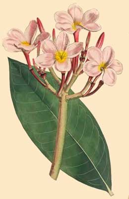 Plumeria is a genus of plants named by Tournefort in honour of his countryman the celebrated Plumier, it comes near to Nerium or Oleander, and contains several species, all natives of warm climates.The present plant is a native of Jamaica, where it is known by the name of Red Jasmine, from whence seeds and large cuttings are often sent to this country, here they require the stove to bring them to flower seed vessels they are never known to produce.The flowers, which are very odoriferous, are produced in July and August in large bunches, on the summits of the branches, from whence the leaves also proceed, the stems, which grow to a considerable height as well as thickness, are naked, and the whole plant loses its foliage from the middle of winter till about the beginning of May, the branches and other parts of the plant, when broken off, give forth a milky juice, the leaves are handsome, and the veins remarkable.Being too tender to bear the open air of this climate, it is kept in the stove even during summer, in hot weather it must have plenty of air, and in cold seasons be sparingly watered.Is propagated by seeds, but more frequently by cuttings, which Miller recommends to be put by for two months or ten weeks, previous to their being committed to the earth.
