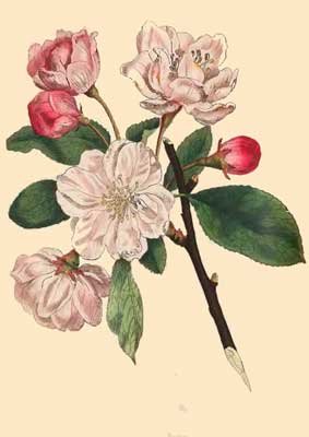 The Chinese Apple Tree when it blossoms in perfection, answers truly to the name of spectabilis, a more shewy or ornamental tree can scarcely be introduced to decorate the shrubbery or plantation, its beauty like that of most trees, whose ornament consists chiefly in their blossoms, is however but of short duration, and depends in some degree on the favourableness of the season at the time of their expansion, which usually takes place about the end of April or beginning of May, the flowers are large, of a pale red when open, and semi double, the buds are of a much deeper hue, the fruit is of little account, and but sparingly produced. Trees of this species are to be met with in some gardens of the height of twenty or thirty feet.Dr. Fothergill is regarded as the first who introduced this Chinese native, he cultivated it in the year 1780, such plants of it as were in his collection, passed at his decease into the hands of Messrs. Gordon and Thompson, in whose rich and elegant Nursery, at Mile End, this tree may be seen in great perfection.Though perfectly hardy, as its blossoms are liable to be injured by cutting winds, it will be most proper to plant it in a shelterd situation.It is usually increased by grafting it on the Crab stock.