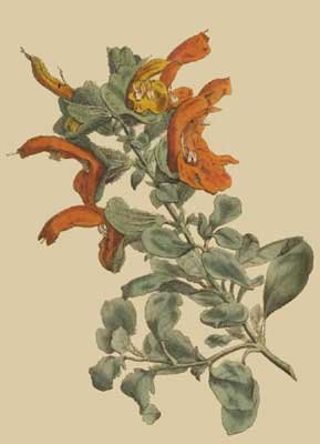 Such as are delighted with the singular rather than the beautiful appearances of plants, cannot fail of ranking the present species of sage among their favourites.It been called aurea, from the colour of its flowers, ferruginea would perhaps have been more expressive of them, when they first open indeed they are of a yellow colour, but they quickly and constantly become of the colour of rusty iron.The leaves are nearly round, and have a pleasing silvery hue a few of them only, and those chiefly at the extremities of the young shoots, are of the form described by Linn?us in his specific character of the plant, and hence Commelins description (vid. Syn.) is to be preferred, as leading us with more certainty to a knowledge of the plant, the colour of the leaves, the colour and unusual magnitude of the blossoms, are indisputably the most striking features of the species, and therefore to be resorted to for my own part, as a friend to the advancement of the science, rather than as the follower of that great man, I see no good reason why colour should not in many instances, especially where expressive characters are wanting, form a part of the specific character in plants, as well as in animals we are told indeed of its inconstancy. I would ask