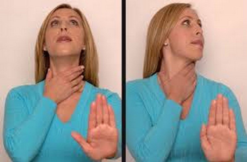 Roll your shoulders up, back, and down to release tension. Then repeat, moving in the opposite direction. Keeping your shoulders immobile, press your chin forward, hold for a moment, and draw back. Gently tilt your chin to point at the ceiling (don’t do this if you have neck problems). Don’t allow your head to flop backward. Bring your back teeth together to stretch the neck. Without moving your chin, swallow seven times to stimulate the thyroid gland. This action may take some time. Gently lower the head. Tuck your chin in slightly and take it toward your chest. Hold this position for a moment, then pivot back to center.