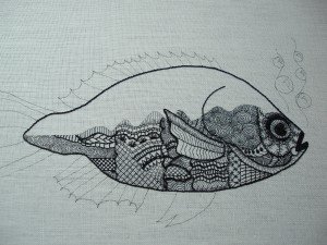 Variegated silks are a popular choice for blackwork today.Blackwork commonly employs a variety of filling patterns worked in Holbein stitch, which looks like backstitch, but is actually reverse running stitch. The design is worked in one direction in running stitch, leaving a stitch space between each stitch. Then, the embroiderer works the design in the opposite direction, filling in the empty spaces with another running stitch.Modern blackwork is popularly used to create geometric designs, but can also be used to stitch beautiful picture embroidery. Various levels of shading can be achieved in blackwork by varying the filling stitches and patterns and the weight of the thread. Modern Blackwork is often effectively combined with counted cross stitch and surface techniques to good effect.