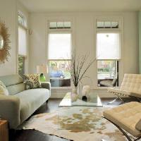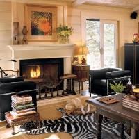This living room shows that you dont need to shy away from bold patterns in a small space. A floral rug and coordinating pillows add color to the space, while an animal print chair heightens the drama. The herringbone fireplace tile is a nice geometric touch.