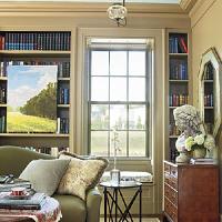 This living room was designed to resemble an early 1900s library; the living room contains a wall of floor to ceiling bookshelves. Two large double hung windows punctuate these built ins, along with cozy window seats below.