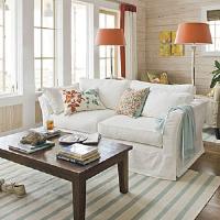 Crisp whites combined with punches of bright colors immediately transport you to the coast. In this living room, aqua accents in the pillows, throw, and rug mimic the oceans dazzling blues, and the pops of bright orange are inspired by the magnificent hues of the setting sun. Whitewashed horizontal shiplap planking evokes the feel of old Gulf front beach houses.