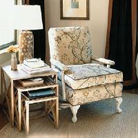 This armchair is re covered in a botanical print fabric. The legs are painted white to lighten the visual weight of the piece. Tucked into a corner of the living room and paired with a set of nesting tables, the chair is a perfect spot for reading.