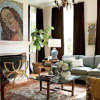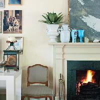 Anchor a room with a traditional rug and accessories, and then juxtapose them with modern art for a fresh feel. The hues of this heirloom rug play off of the colors of the bottle cap portrait above the fireplace.