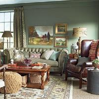 Bring the formal parlor back to your home this ones for Mom and Dad, not the kids. Created with the feel of a warm and cozy den, this front room contains rich upholstery and textiles, dark stained furniture, and a leather wing chair.