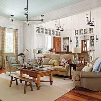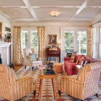 In this living room, the heart pine flooring came from a South Carolina textile mill. It has the original nail holes, and if you look closely, you can still see oil stains from factory weaving machines.