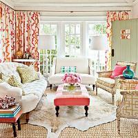 The designer started with fabric selections to set the room s happy mood and a bright color palette of pink, turquoise, and chartreuse. Fabrics have to be matchy matchy to communicate with each other. If they share a similar vibrancy and color temperature, they ll look good together.
