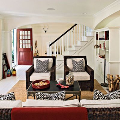 Use bright colors and strong patterns to punctuate an otherwise neutral space. The red accessories in this living room add an energetic punch without overwhelming the area.