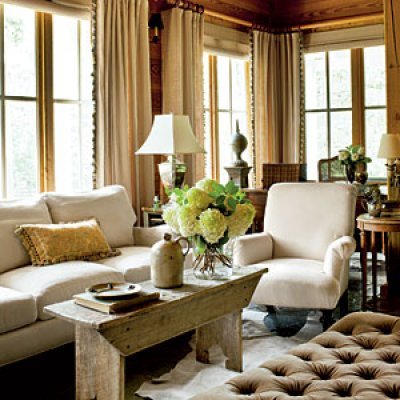 Barn builders used post and beam construction in rough hewn yellow pine. Linen curtains with vintage trim add elegance to the rustic room.