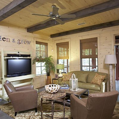 Take your decorating cues from your surroundings. This home is on a lake surrounded by trees. Moss greens and mushroom browns paired with a twig and bark side table truly bring the outdoors in.