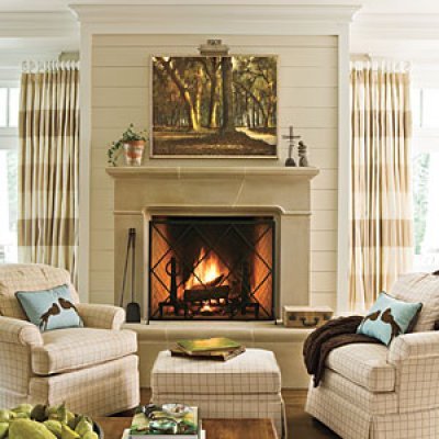 Local artwork is a meaningful accessory. A locally painted scene of Florida live oaks hangs above this family rooms cast stone fireplace.