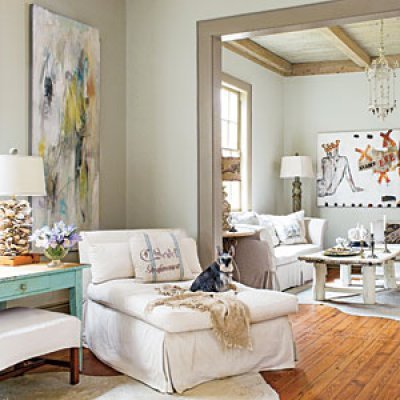 To give Country French my minimalist spin, I avoid the expected ruffles and plaids and keep it about the painted antiques and white linens, says homeowner and designer Regina Lynch. In this house, curtains would have been too much, so instead I painted the trim a dark gray for a similar, but cleaner, look.