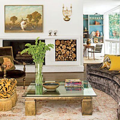 The 11 foot long vintage sofa in this living room is a mod counterpoint to a pair of traditional antique chairs.