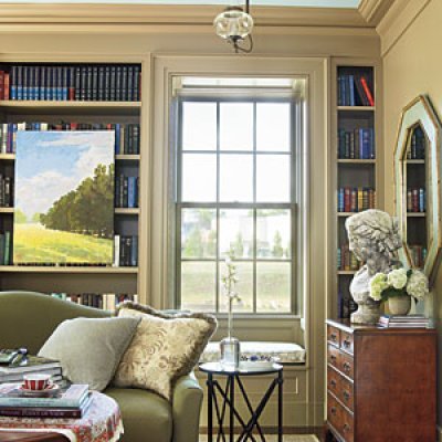 This living room was designed to resemble an early 1900s library; the living room contains a wall of floor to ceiling bookshelves. Two large double hung windows punctuate these built ins, along with cozy window seats below.