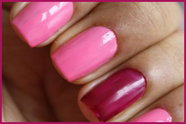 The third step starts once the base coat dries completely. Apply a coat of pink polish and purple polish (on ring finger). Repeat this twice.