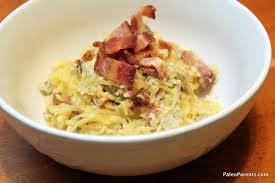 A creamy pasta substitute recipe featuring crisp bacon and eggs over healthy spaghetti squash.