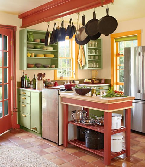 An open plan ground floor a mere 22 by 23 feet in this New Hampshire farm home contains a kitchen and dining area. A local carpenter built the pine island, and the owner fashioned the pot rack by mounting a two by two painted the same color as the beam overhead. The walls are painted Golden Straw and the cabinets are painted Sherwood Green, both by Benjamin Moore.