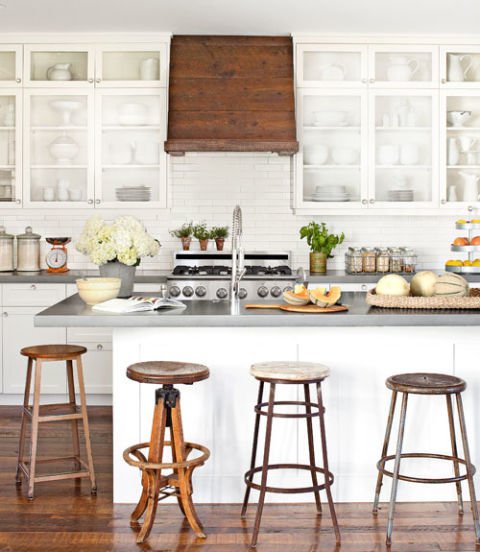 An assortment of old stools provide quirky charm in the kitchen of this Oregon home. For $379, barn wood left over from the floor installation covers a metal Ikea hood. The durable concrete countertops are from Cement Elegance.