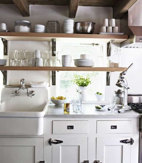 An extra deep farmhouse sink and convenient shelving make clean up a breeze.