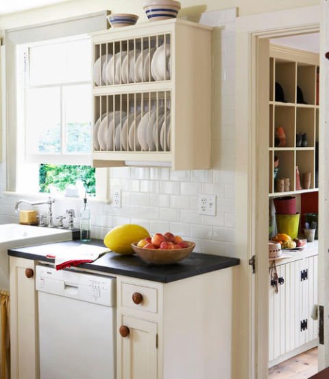 Instead of claustrophobia inducing wall to wall cabinetry, this kitchen has two open upper storage units, including this plate rack. The lower cabinets, with solid doors, offer hidden storage.