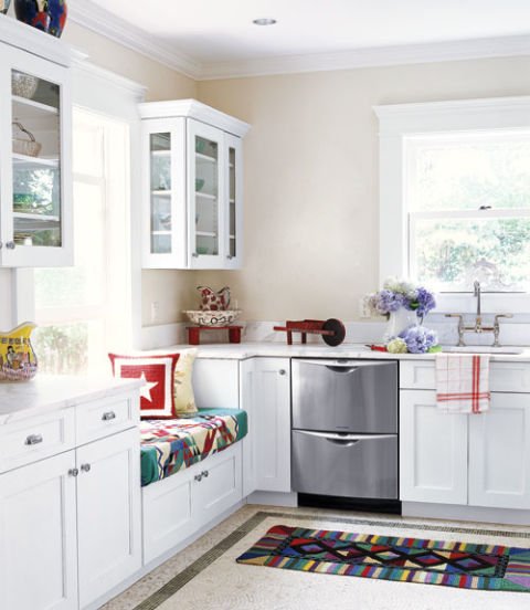 A well placed window seat looks out to a gorgeous yard. The handmade quilts, rugs, and pillows add bursts of color to the all white room.