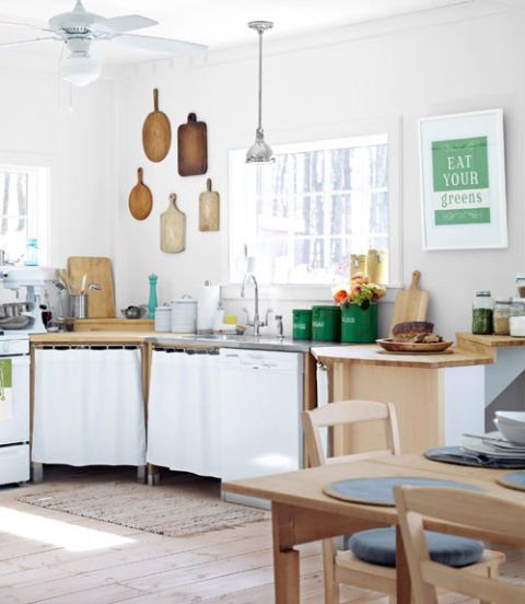 Skip upper cupboards in favor of an open and airy kitchen. A Haley & Lucas print reminds diners to eat their veggies.