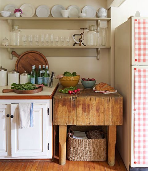 English ironstone, Picardie glassware, and an antique pharmacy scale line the kitchen shelves in this New York garden estate. The pine butcher s block came with the house.