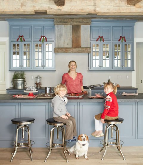 For a warm, rustic feel, the owner of this Connecticut farmhouse chose muted colors and rough hewn textures, like the kitchen s gray blue Shaker style cabinets and honed granite countertops. Ceiling beams reclaimed from an old Canadian barn give the new structure charisma beyond its youthful age. The range hood, made on site from wood leftover from the house s construction, reinforces the simple, homespun feel.