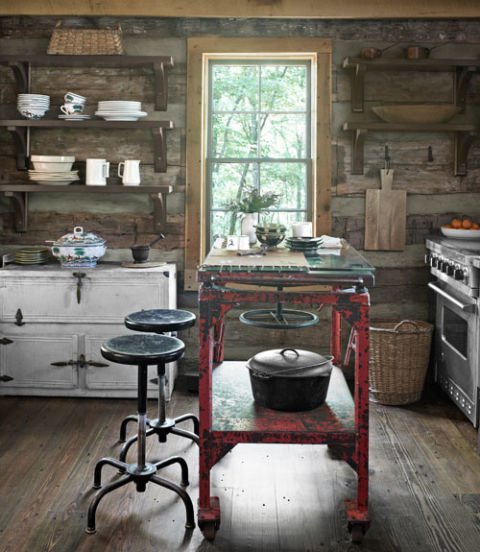 In this Tennessee cabin, an industrial worktable, topped with custom cut glass, serves as the kitchen s island; the stools were also rescued from a factory. A vintage zinc icebox offers hidden storage, while open Douglas fir shelves hold dishes and cookware. The stainless steel stove is Jenn Air.
