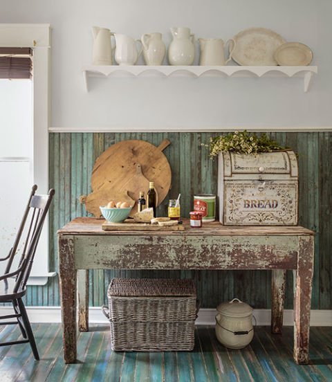 A salvaged worktable provides this kitchen s prep surface. The owner collects pig shaped cutting boards and snagged this little guy along with the two round ones at a local antiques shop. The breadbox houses the silverware.