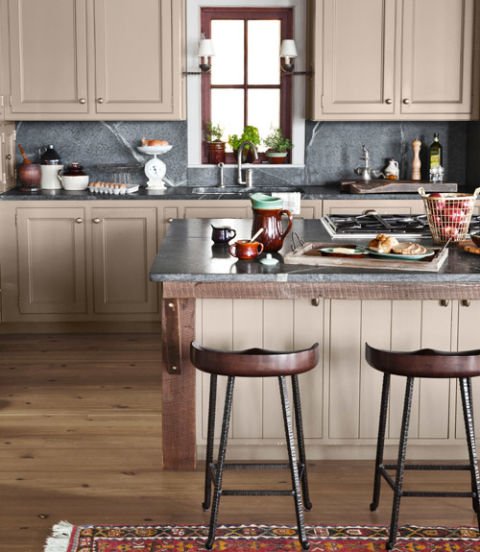 In this Georgia lake house, soapstone counters and a matching backsplash complement the kitchen s custom cabinetry, including an island framed with salvaged heart pine beams. The iron and mahogany stools are by Wright Table. The cabinets and island side is painted Dawn Mist by Pratt & Lambert.