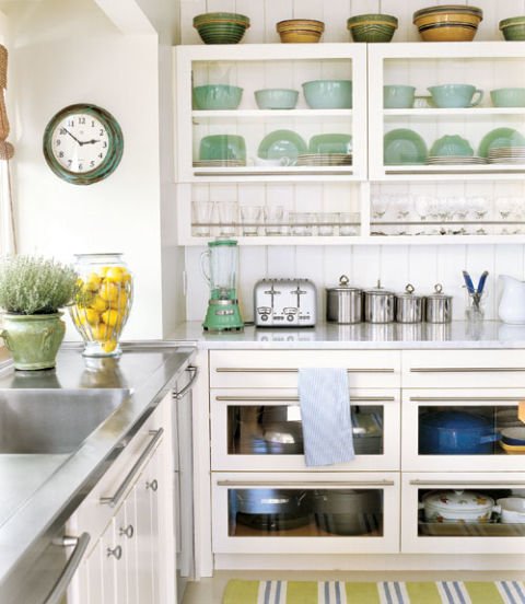 Glass fronted drawers are reminiscent of 19th century apothecary cabinets. The practical design makes it easy for the family to find dishes when helping out in the kitchen. Bead board wainscoting on the backsplash reinforces the relaxed effect.